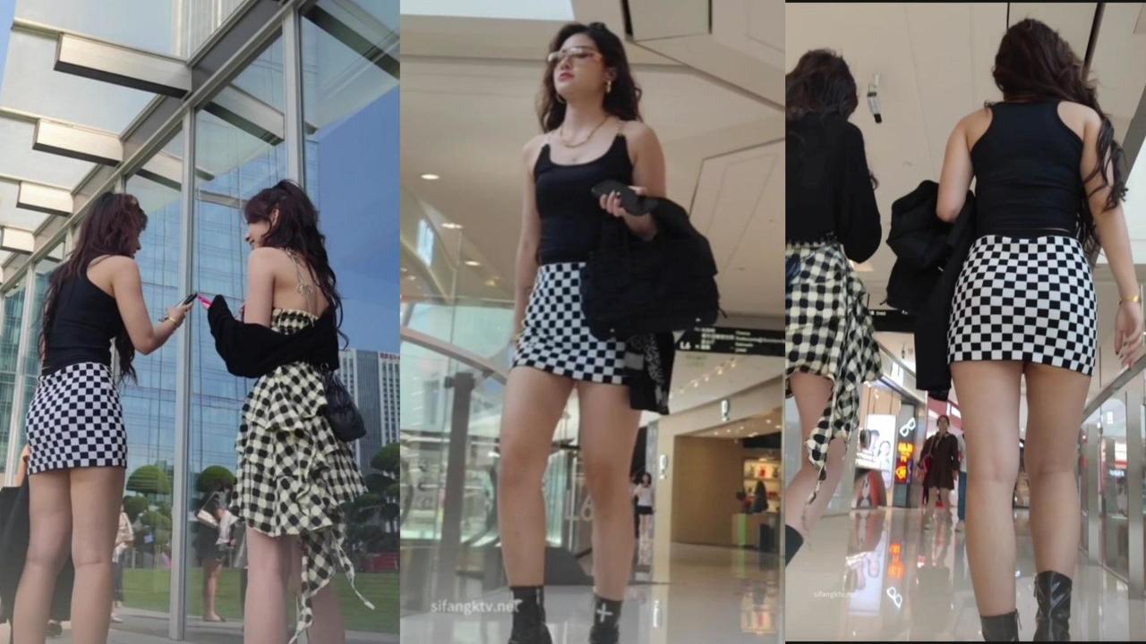 短裙靓女和闺蜜逛街。宽松黑布遮不住灰色内内